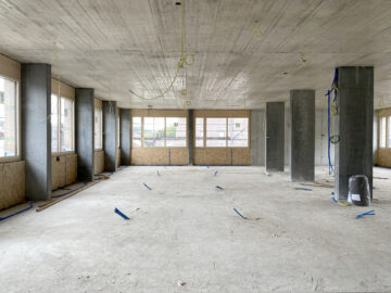 Die Hybridbauweise in Holz und Beton nimmt Form an. Im Untergeschoss bis zum 1. Obergeschoss sind die Arbeiten rege im Gange.