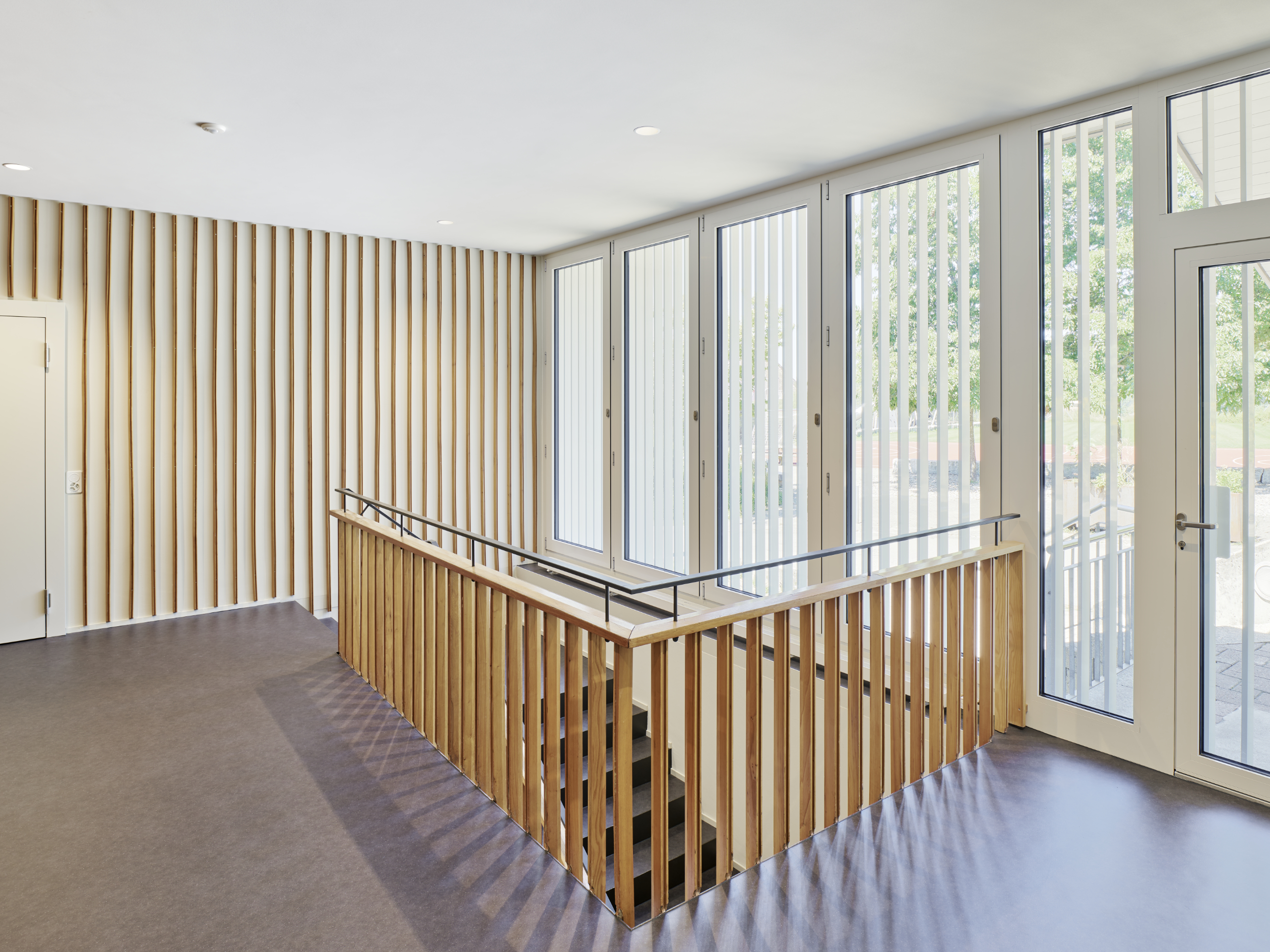 Der neue Haupteingang mit einer Glasfassade bringt viel Tageslicht ins Foyer. Das neue Foyer ist grosszügig und kann für Anlässe genutzt werden, wie auch die neue Terrasse auf Eingangsniveau. Neue Sanitäranlagen wurden eingebaut, und es entstanden zwei grosszügige Multifunktionsräume.